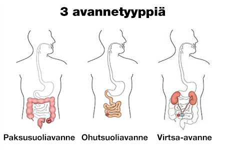 Ne ovat paksusuoli-, ohutsuoli- ja virtsa-avanne.