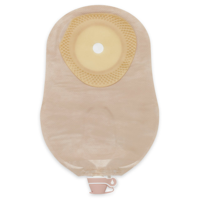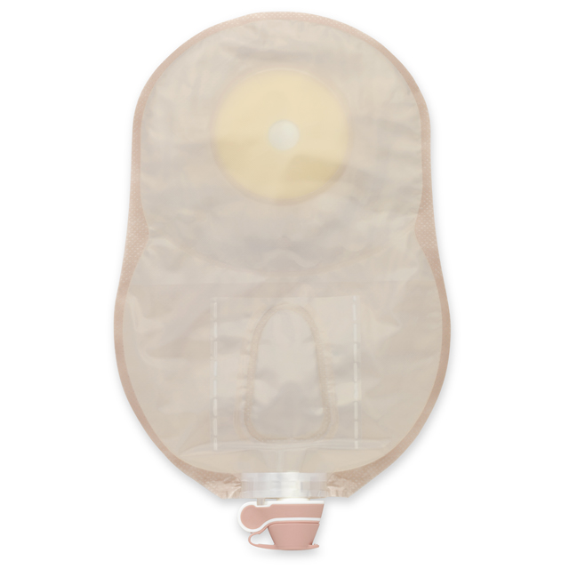 Flerkammarpåse med konvex hudskyddsplatta och antirefluxventiler som förhindrar tillbakaflöde av urin. Töms via tappningskran med steglös reglering av flödet.